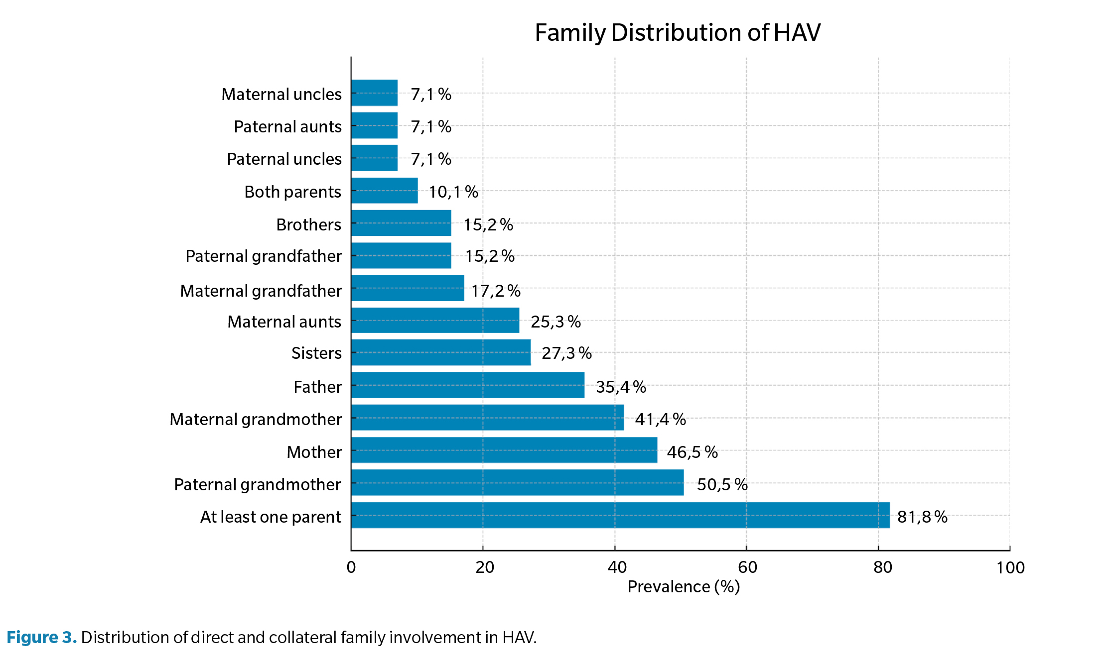 With respect to familial involvement, 81.8% of subjects reported a family history of HAV in at least one parent, with the mother being the most affected relative (46.5 %), followed by the father (35.4 %) and both parents (10.1 %). The paternal grandmother was the most frequently referenced grandparent (50.5 %). In 18.2%, no direct family history was identified, and 39.4 % reported that at least one sibling also had HAV. The complete distribution is shown in Figure 3.