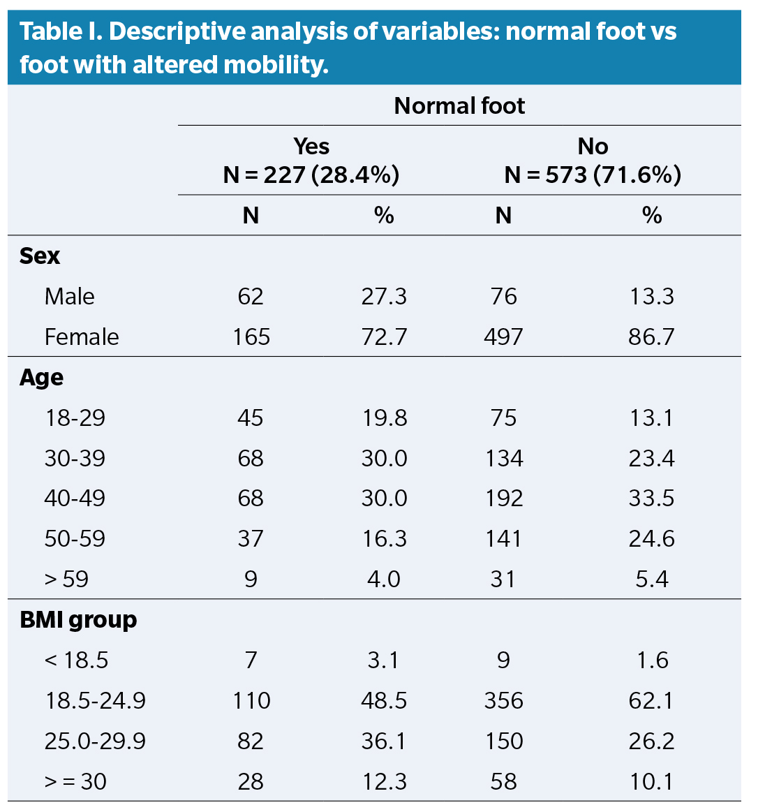 Patients and methods: A cross-sectional observational study was conducted with 400 adults aged 18 to 65. Dorsiflexion, plantarflexion, and total mobility of the first ray were measured using a validated instrument. Feet were classified as normal or non-normal based on clinical criteria, and low back pain was assessed using a visual analog scale.