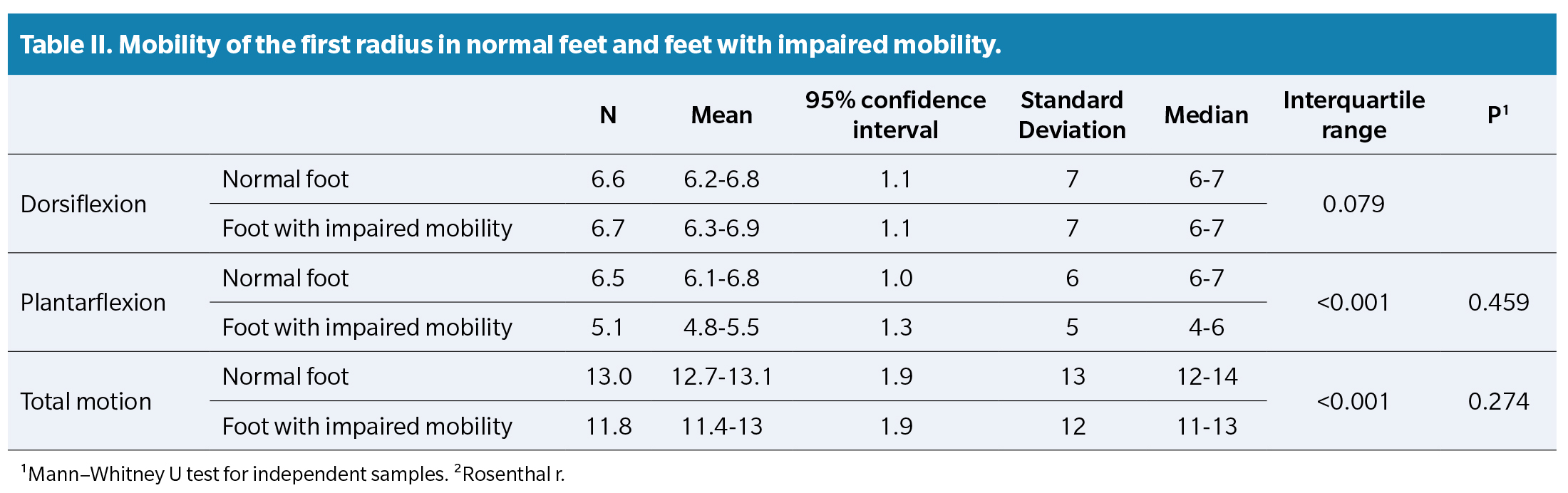 Table 2 shows differences in first-ray mobility variables between normal and altered-mobility feet.