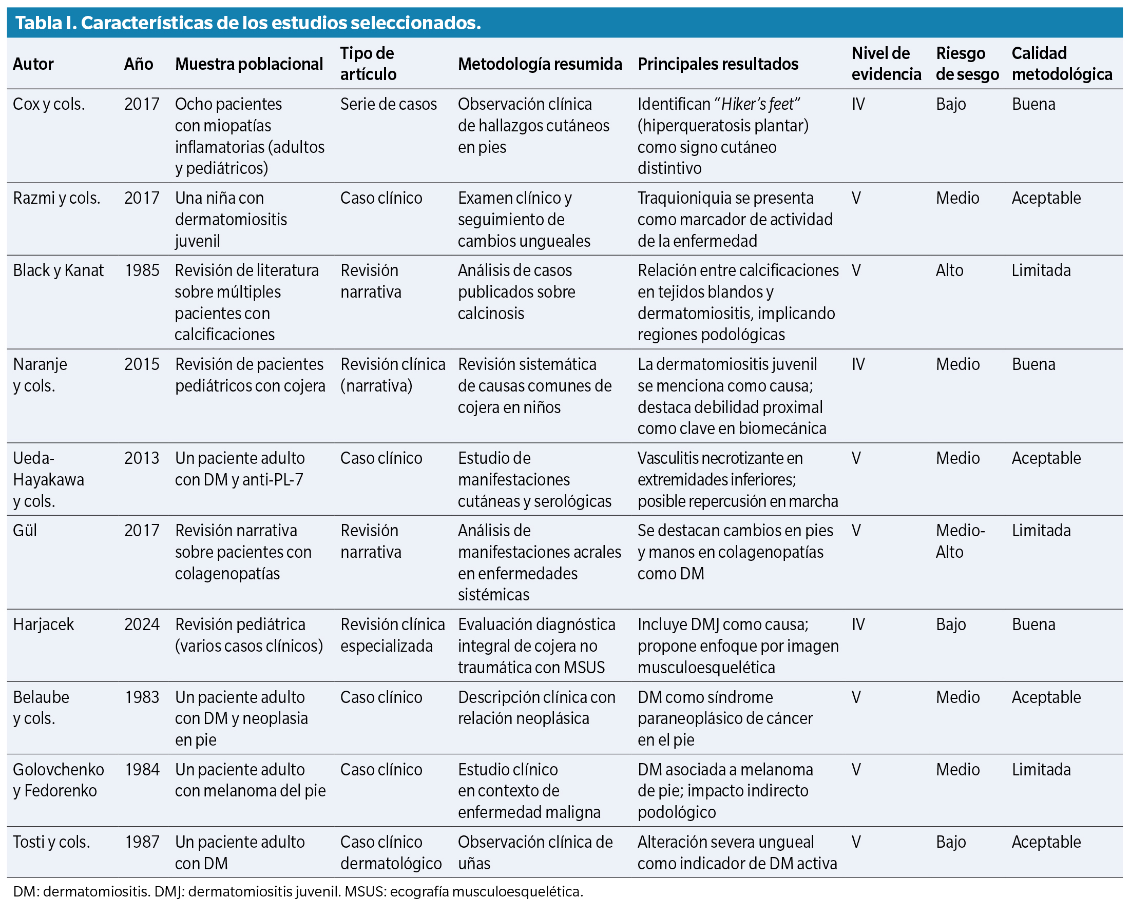 Los estudios con mayor calidad metodológica fueron los de Cox y cols. (2017), con una serie de casos bien documentada sobre hallazgos cutáneos plantares (“Hiker’s feet”), y Harjacek (2024), quien plantea un enfoque diagnóstico integral para la cojera en niños, incluyendo a la DMJ como etiología frecuente, con uso de ecografía musculoesquelética. Ambos trabajos fueron clasificados con calidad buena y riesgo de sesgo bajo.