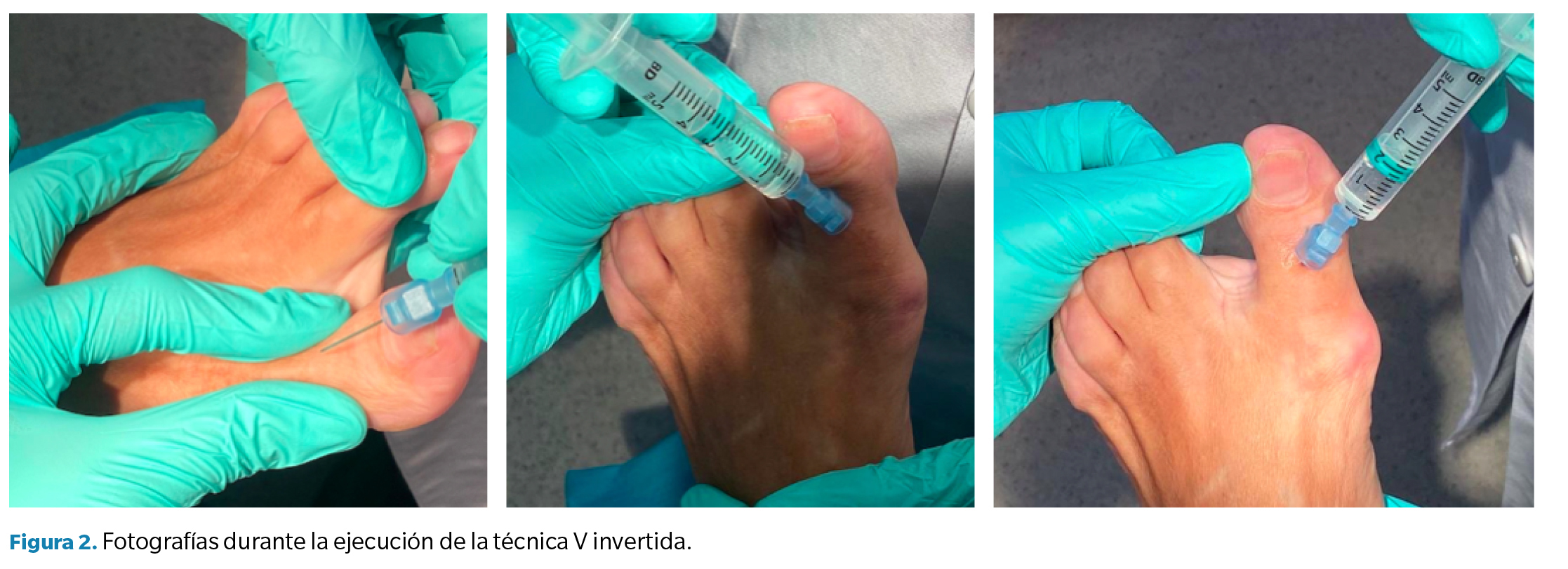 Una de las técnicas más utilizadas es el bloqueo en anillo, y entre ellas predomina la técnica H descrita 1952 por el Dr. Frost(6), en la que se realizan dos infiltraciones en los márgenes medial y lateral de la falange proximal. Sin embargo, no siempre se logra un bloqueo completo, lo que puede requerir nuevas infiltraciones, aumentando la dosis de fármaco anestésico y el dolor postoperatorio. En 2017 se presentó la técnica V invertida(7) como un intento de mejorar y actualizar la técnica H, que permite un bloqueo con una sola infiltración y dos lateralizaciones.