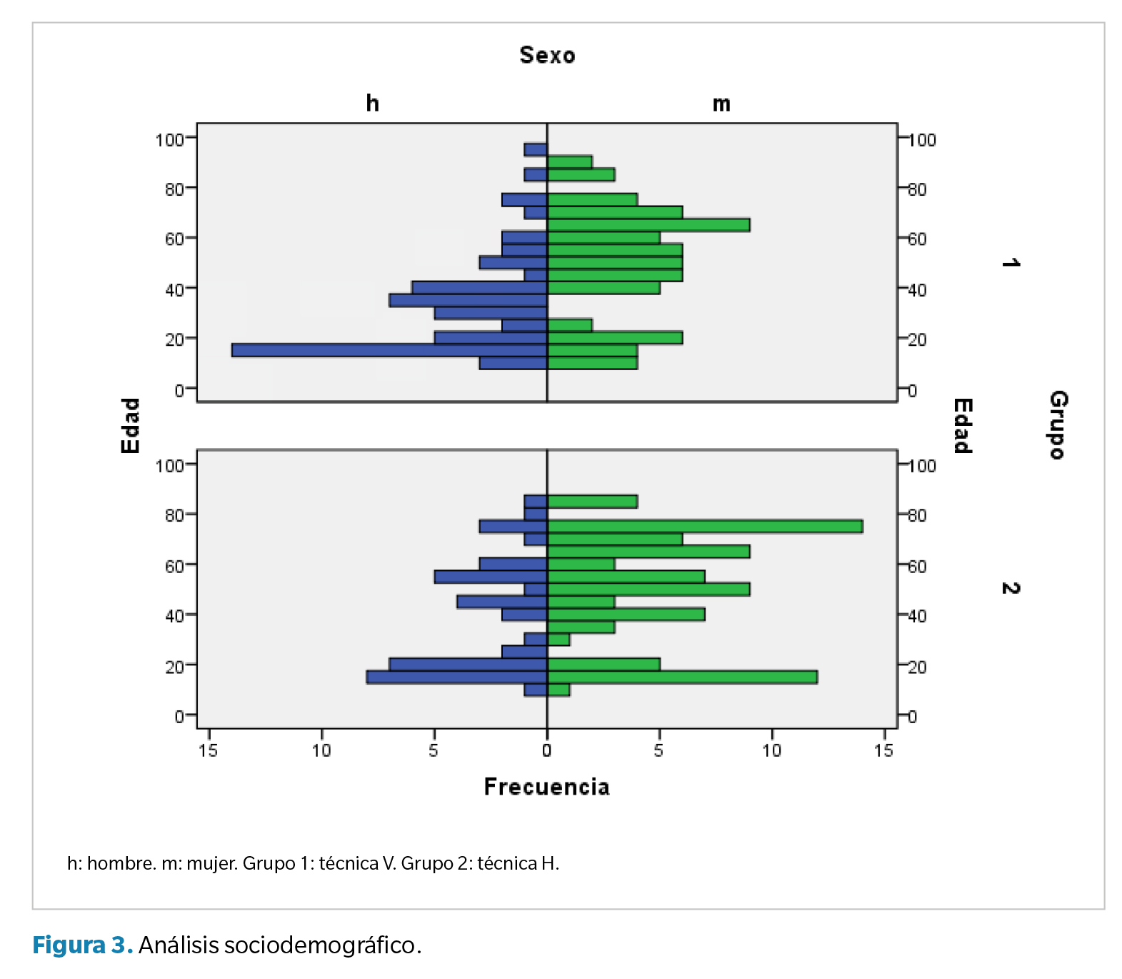 En la técnica V se realizó en un total de 123 cirugías de las cuales 68 eran hombres y 55 mujeres con una media de 47.81 años. En la técnica H se realizó en un total de 123 cirugías de las cuales 84 fueron hombres y 39 mujeres con una media de 46.61 años. Como se puede observar, la media de la edad entre ambas técnicas no mostró diferencia significativa (p > 0.05). Sin embargo, se encontraron diferencias significativas con relación a la distribución del género (p < 0.05). En la Figura 3, se pueden observar ambas conclusiones de acuerdo con la distribución de la edad y el género para ambas técnicas.