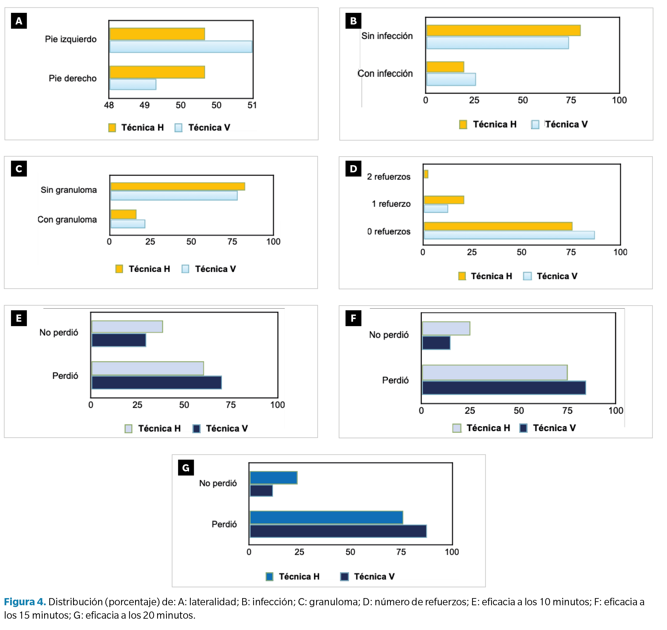 En la Figura 4 se muestran las distribuciones (en porcentajes) de las siguientes variables: lateralidad, infección, granuloma, número de refuerzos, eficacia a los 10 minutos, eficacia a los 15 minutos y eficacia a los 20 minutos para las técnicas V y H.