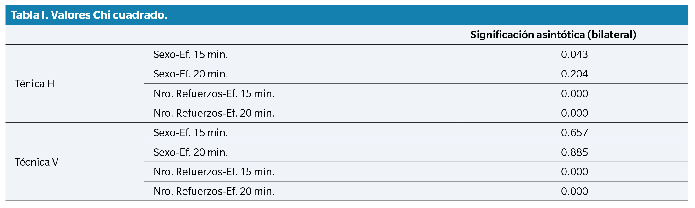Considerando las variables más importantes en el bloqueo, se analizó la influencia y/o asociación que puede tener cada una de ellas con la eficiencia obtenida a los 15 y 20 minutos para ambas técnicas estudiadas. En la Tabla 1 se observan los resultados obtenidos de aplicar la prueba de Chi cuadrado (p < 0.05). Se observa que existe una dependencia significativa entre la variable número de refuerzos y la eficacia a los 15 y 20 minutos para ambas técnicas estudiadas.