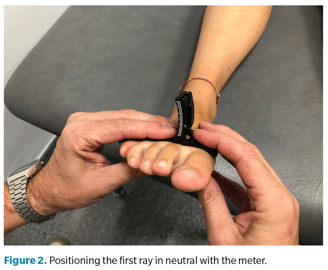 First-ray mobility was measured with the Medidor de Primer Radio® (Fresco Podología SL, Barcelona, Spain), a valid, reliable instrument used in previous studies (Figure 1) (7,8,13). For the measurement, one hand maintained the horizontal arm over the heads of the 2nd–5th metatarsals while the other hand positioned the opposite horizontal arm vs the head of the 1st metatarsal. From this position, the 1st metatarsal head and horizontal arm were moved upward to read dorsiflexion (mm) on the vertical arm and downward to read plantarflexion (Figure 2, Figure 3, Figure 4) (7,8). Each foot was measured three times; the mean was used for analysis.