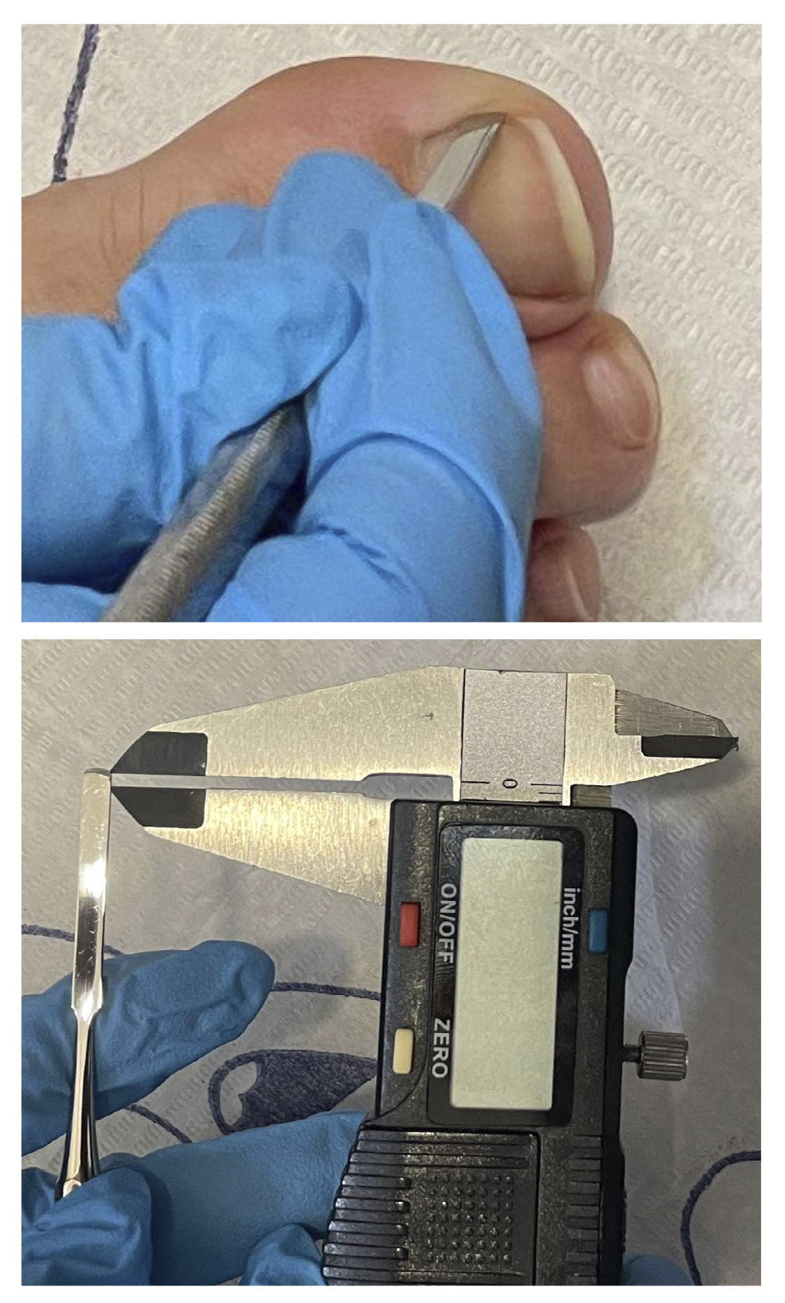 Inflammation assessment was conducted using a digital caliper and a straight metal spatula. The spatula was carefully inserted between the periungual fold and the nail plate, with the precise distance measured from the edge of the spatula to the point covered by the periungual fold, thereby obtaining an exact measurement of the millimeters of periungual fold inflammation extending into the nail plate (Figure 2).