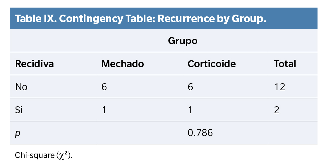 Recurrence results by group were as follows: six cases in the gauze-packing group and six in the corticosteroid group showed no recurrence, while one case in each group showed positive recurrence. In total, 12 patients did not experience recurrence, while two did. Recurrence results showed no significant differences (p = 0.786) (Table 9)
