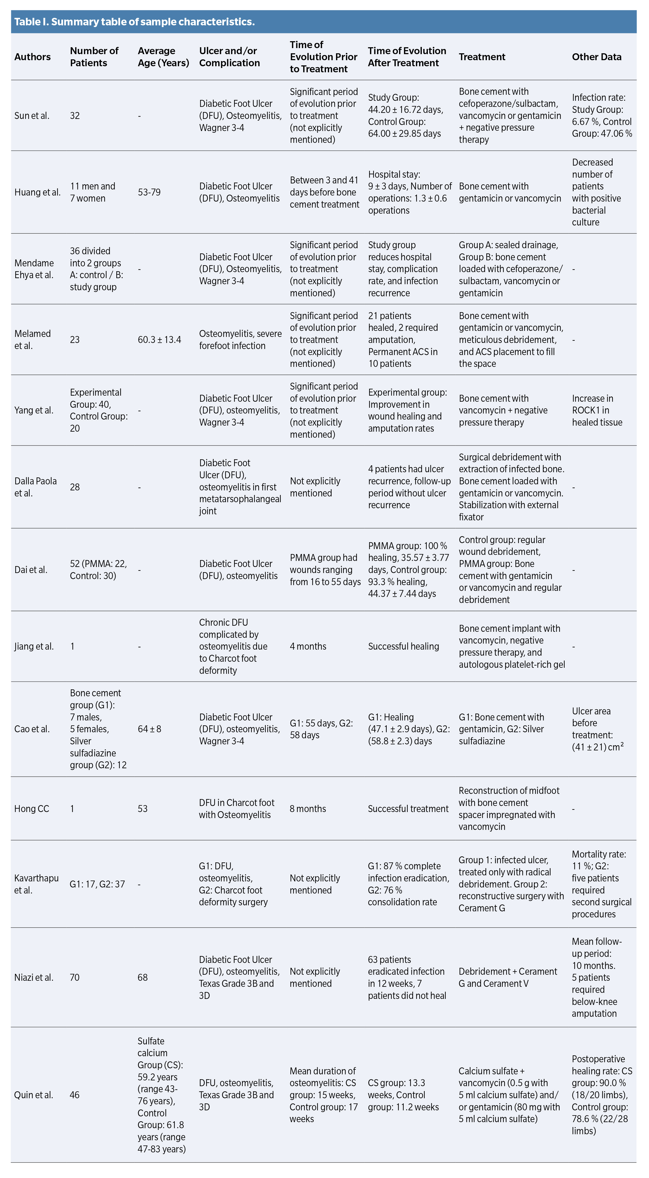 Inclusion criteria were articles published between 2010 and 2024 in spanish, english, chinese, german, Italian, and portuguese. The types of articles included were meta-analyses, randomized controlled trials, journal articles, comparative studies, and case studies related to the use of bone cement in the treatment of complications and/or injuries of the diabetic foot, studies that combined bone cement with other treatment methods, such as flaps or vacuum-assisted closure and studies where the subjects had ulcers with osteomyelitis.