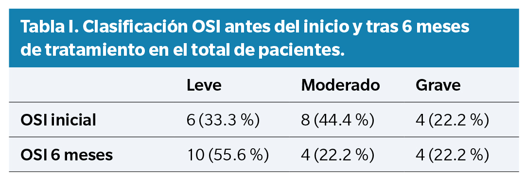 Los resultados del OSI inicial y final del total de los pacientes pueden observarse en la Tabla I. Hubo una mejora estadísticamente significativa (p valor = 0.012) del OSI inicial y final en el total de los pacientes, independientemente del tratamiento recibido (Figura 1). Además, se observó un aumento de frecuencias en la clasificación leve y una disminución en los casos moderados, mientras que los casos graves se mantuvieron constantes.