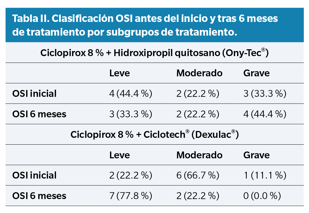 En este estudio piloto realizado sobre una muestra de 18 pacientes en tratamiento por onicomicosis, observamos una mejora de la clasificación OSI tras 6 meses de tratamiento con ciclopirox 8 % + HPCH y con ciclopirox 8 % + Ciclotech® (p = 0.012). Estudios previos han validado el OSI como una clasificación con una elevada concordancia interobservadora (ICC = 0.899), independientemente de la experiencia clínica del clínico que lo use, descartando la posibilidad de existir un sesgo de medición en el estudio(10). Zalacaín y cols.(16), en un ensayo clínico realizado en una muestra de 381 pacientes, estudiaron la eficacia de estos tratamientos a través de tasas de curación completa, micológica y mejoría (cura micológica y reducción de los signos clínicos de onicomicosis ≥ 20 %), y no observaron diferencias estadísticamente significativas entre ambos grupos (p = 0.839) en las tasas de curación completa a las 52 semanas de tratamiento, que fueron de 10.48 % en el grupo tratado con ciclopirox 80 mg/g + Ciclotech® (p = 0.012), y de 11.1 % en el grupo tratado con ciclopirox al 80 mg/g + HPCH. Tampoco encontraron diferencias significativas entre ambos grupos en términos de cura micológica (tasa de curación del 32 % con ciclopirox 8 % + Ciclotech® y del 27 % con ciclopirox al 80 mg/g + HCPH) y mejoría (27.2% en el grupo tratado con ciclopirox 8 % + Ciclotech® y 20.6 % en el grupo tratado con ciclopirox al 80 mg/g + HPCH) (16).