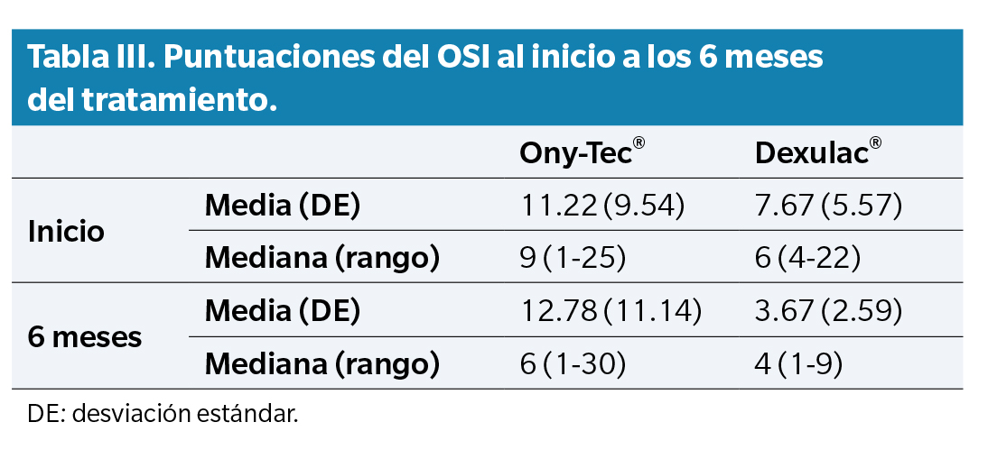 Bajo nuestro conocimiento este es el primer estudio que informa de las puntuaciones medias y cambios en la clasificación del OSI al inicio y tras 6 meses de tratamiento con estos dos productos, sin encontrar diferencias estadísticas entre ambos tratamientos.