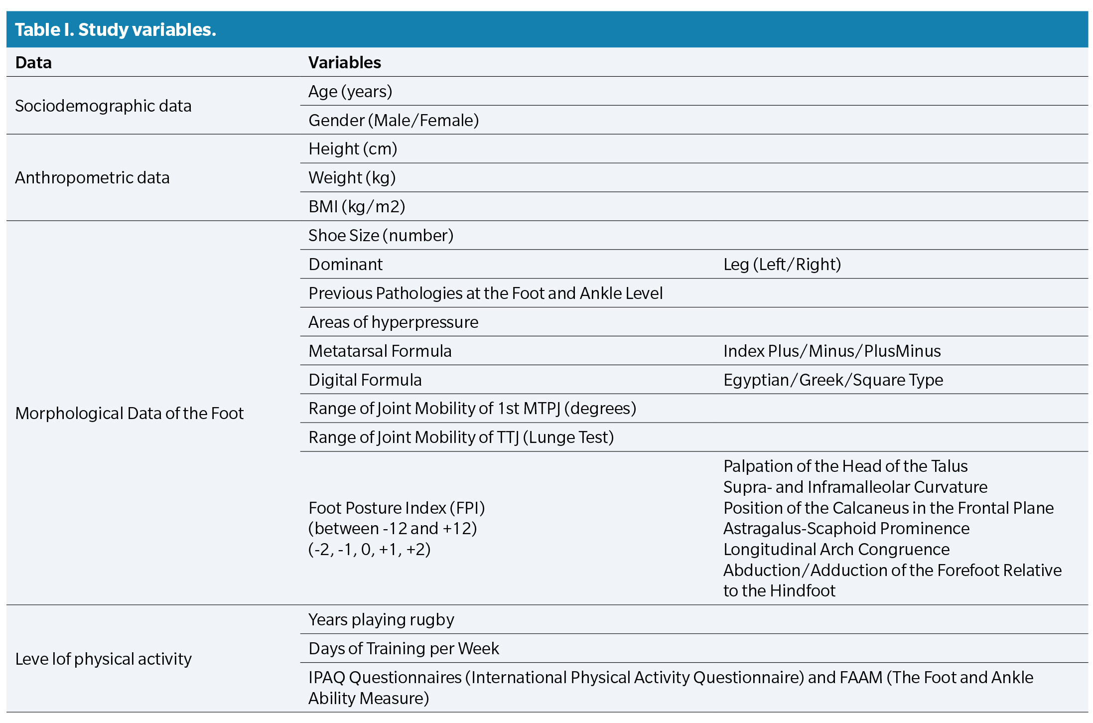 Inclusion criteria were male and female players from the rugby team at the University of Málaga; players over 18 years of age. Exclusion criteria were: players suffering from any degenerative disease, surgical intervention at the level of the tibiofibular-talar joint or 1st metatarsophalangeal joint and orthopedic or extrapodal treatments.