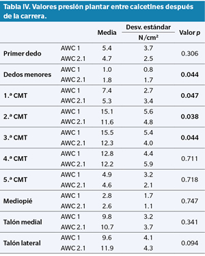 En el mismo tipo de calcetín (AWC 1), antes y después de correr 10 kilómetros, las mayores presiones plantares se encontraron en el tercer metatarsiano con 13.1 ± 4.5 N/cm2 antes y 15.5 ± 5.4 N/cm2 tras la carrera, seguido del segundo metatarsiano con de 9,8 ± antes y 15,1 ± después de correr. Los valores más bajos de presión plantar se encontraron en la zona del medio pie y los dedos menores (Tabla III).