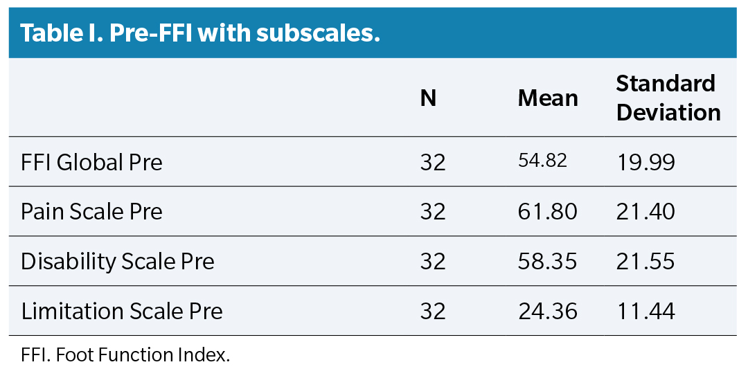 The mean Foot Function Index (FFI) score in the overall group was 54.82 ± 19.99. Regarding the different scales: 1) pain had a pre-score of 61.80 ± 21.40, 2) the pre-disability scale was 58.35 ± 21.55, and 3) the limitation scale had a mean of 24.36 ± 11.44 (Table 1).