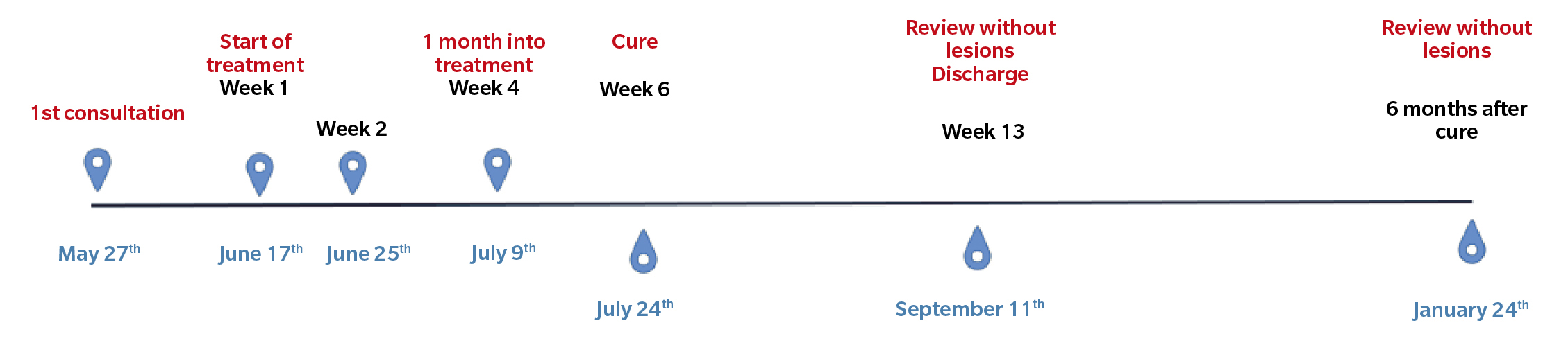 At two weeks (Figure 2. Week 6), in the new review, complete resolution of all lesions and absence of symptoms were observed (Figure 5). Despite the absence of lesions, due to the long evolution time of the lesions, the patient was instructed to apply the treatment at home for two more weeks until it was considered finished, and definitive discharge was not given, scheduling a review for one and a half months later.