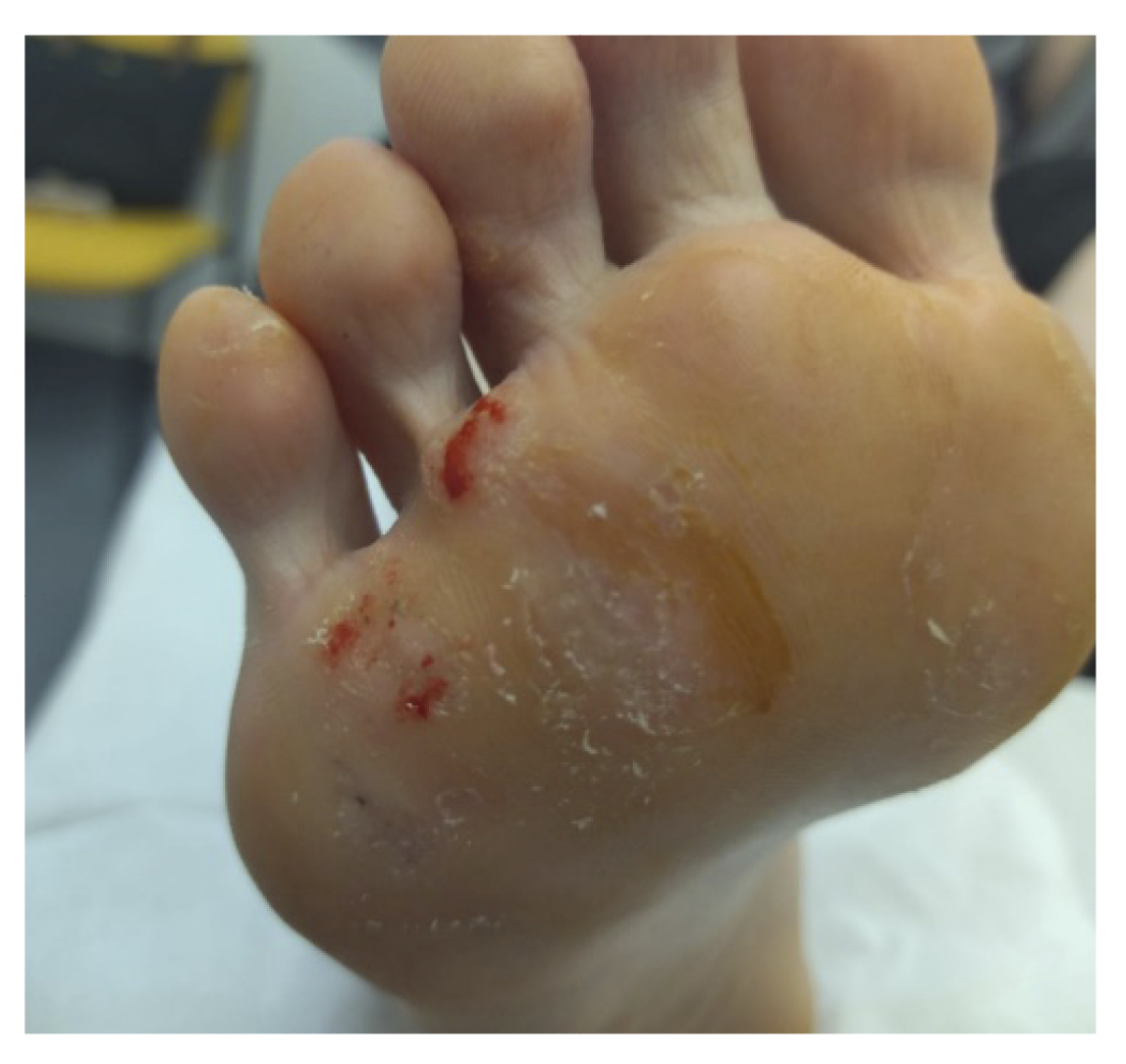 The patient reported pain while walking and having to modify her gait to avoid the pain disabling her in her daily life. Significant irritation and skin flaking due to previous chemical treatments were observed. The patient reported being psychologically affected due to the lack of improvement over the past few years and the limitations she faced due to the increasing pain she had experienced in recent years (Figure 1).