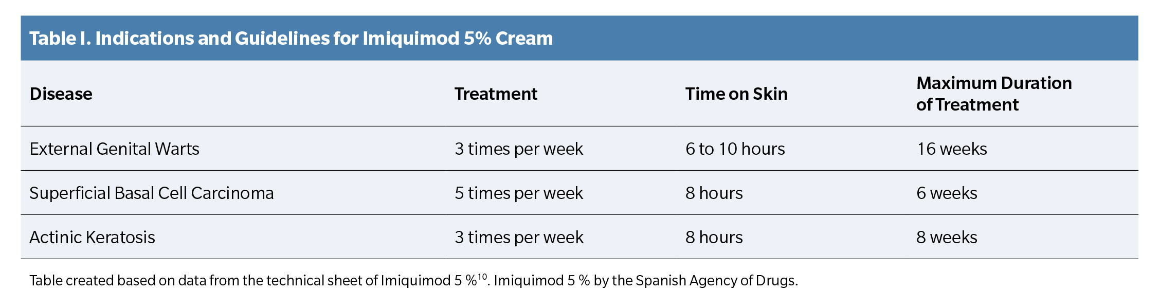 Imiquimod 5% cream is an immune response modulator currently approved by the Spanish Agency for Medicines and Health Products (AEMPS) for the treatment of genital warts, superficial basal cell carcinoma, and actinic keratosis in adults (Table 1) (10).