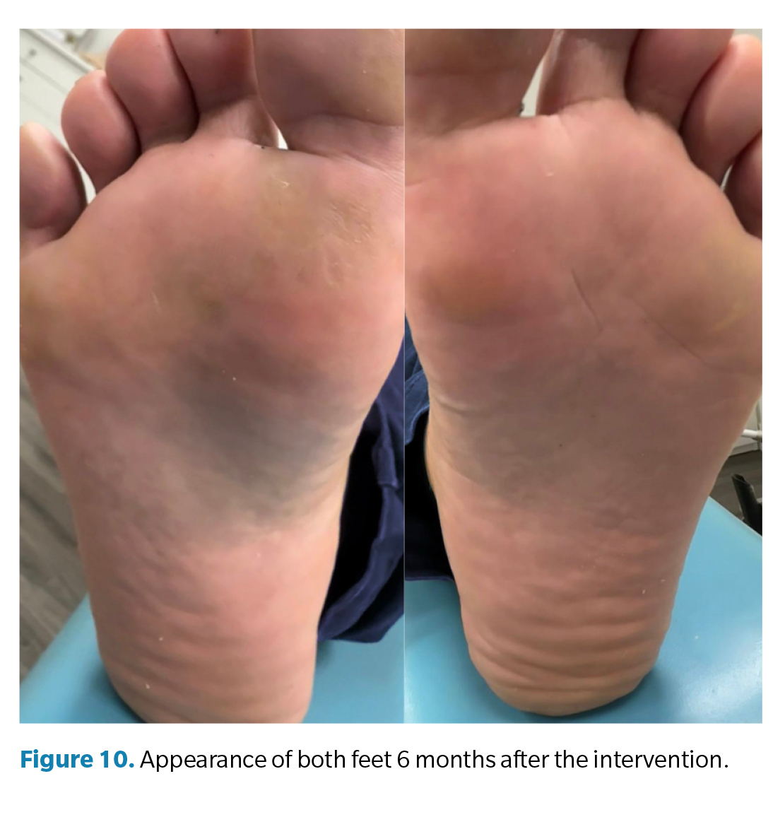 The improvement in appearance is increasingly evident, particularly in the contralateral foot. Hyperkeratosis was debrided from the untreated foot (Figure 9).