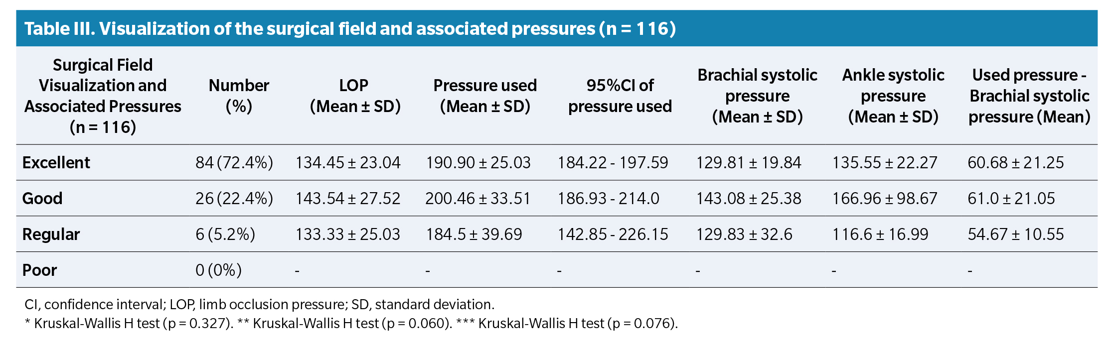 Table 3 shows the percentages of surgical field quality and systolic blood pressure values in the arm and ankle, as well as the LOP in each category. Using the method described with the LOP value, the quality of the surgical field was Excellent in 84 cases (72.4%), Good in 26 cases (22.4%), and Fair in 6 cases (5.2%). No cases of poor-quality surgical field were ever reported. The Kruskal-Wallis test did not show statistically significant differences between the Excellent, Good, and Fair quality field groups, both in the pressure used (p = 0.327) and in the systolic blood pressure in the arm (p = 0.060) and ankle (p = 0.076).