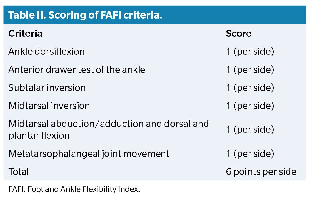 For this assessment, the Beighton test has become the most widely used tool in both clinical and research settings(7).. However, this test presents limitations, as it provides only a general approximation of joint laxity without specifically addressing the foot–ankle complex, which is crucial in flexible flatfoot. In this regard, the Foot and Ankle Flexibility Index (FAFI) has emerged as a recent alternative, designed specifically to measure foot and ankle flexibility. Its application could provide more detailed and clinically useful information in pediatric contexts(8,9º)..