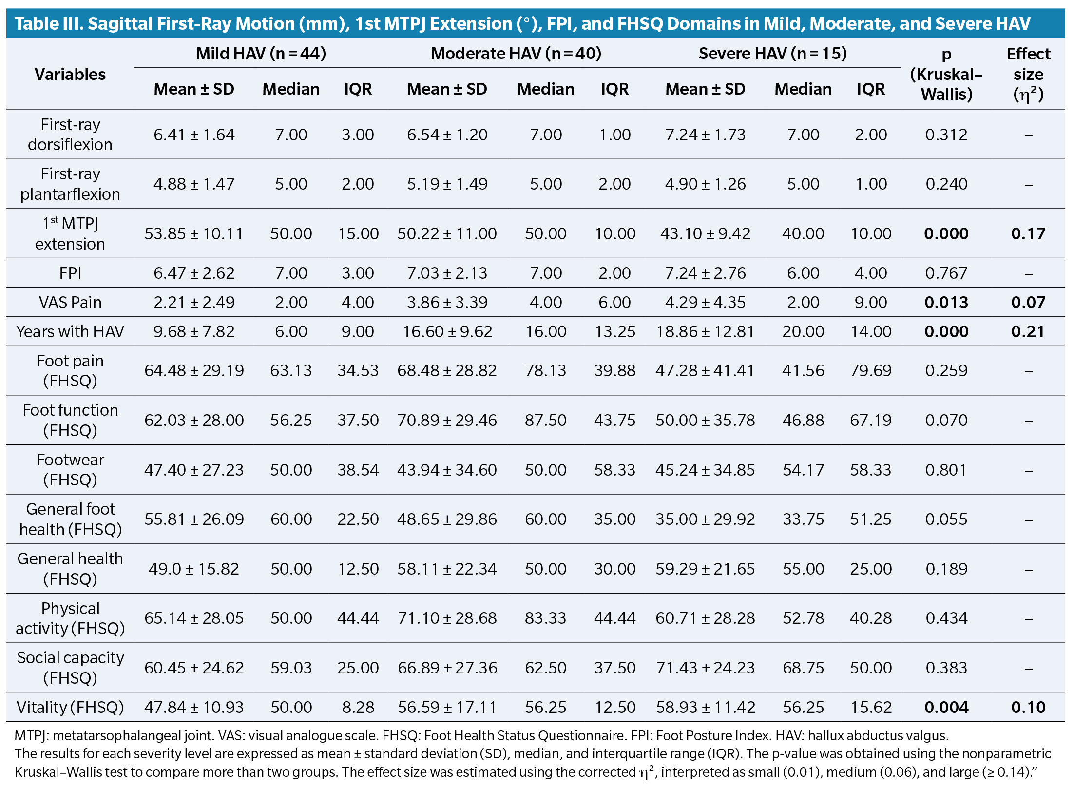 When comparing HAV severity grades (Table 3), significant differences were found in: 1) 1st MTPJ extension (p < 0.001), which decreased as severity increased, with ~10° difference between extremes; 2) Foot pain, with mild cases differing by 2 points from moderate cases, while severe cases displayed a wide interquartile range (9), reflecting notable variability (p = 0.013); 3) Years of deformity evolution, which increased progressively: median 6 years (mild), 16 (moderate), and 20 (severe), with more than a 10-year increase across groups (p < 0.001); 4) Vitality domain of the FHSQ, with moderate and severe cases scoring higher medians (56.25) than mild cases (50) with slightly wider interquartile ranges (p = 0.004). In contrast, median values for first-ray dorsiflexion, plantarflexion, and FPI were similar across severity groups, with narrow interquartile ranges.