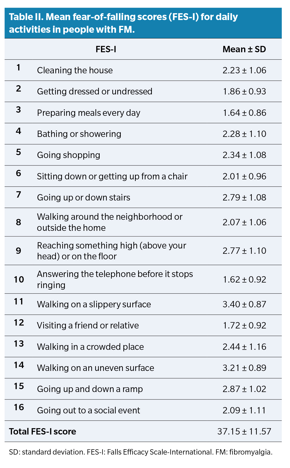 Mean FES-I score was 37.15 ± 11.57 points. The activities generating the greatest concern were walking on slippery surfaces (3.40 ± 0.87), walking on uneven surfaces (3.21 ± 0.89), and going up or down a ramp (2.87 ± 1.02) (Table 2).