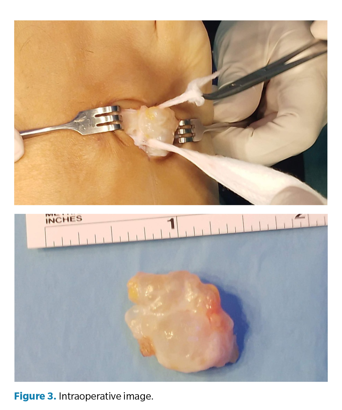Given the failure of conservative treatment, outpatient surgical excision was performed in August 2025 (Figure 3). The procedure was conducted under local anesthesia using a peripheral nerve block (5 mL of 3% mepivacaine) and with pneumatic tourniquet ischemia at the distal third of the leg (250 mm Hg). Diazepam® 5 mg was administered for sedation, and intraoperative prophylaxis consisted of 2 g of IV cefazolin. A longitudinal incision was performed over the course of the extensor tendon of the 4th toe, followed by careful blunt dissection to identify the cyst capsule. Complete excision of the ganglion, including the pedicle and associated synovial sheath, was then performed while preserving adjacent tendon structures. Closure was achieved in layers: deep layers with absorbable suture (Vicryl 3/0®) and intradermal cutaneous closure with Monocryl 5/0®.