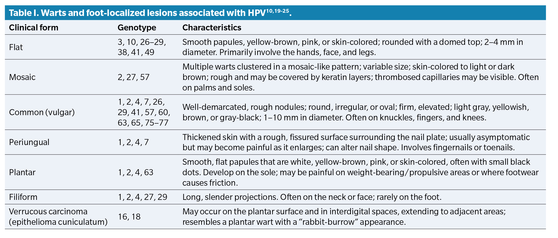 Warts are benign skin lesions caused by human papillomavirus (HPV) (1). They are small, nonenveloped, double-stranded DNA viruses(2). Warts can substantially affect quality of life and may cause serious disease in certain immunocompromised populations. (1)The estimated prevalence of cutaneous warts in the general population is 7-12 %(3). More than 350 HPV genotypes are currently known; of podiatric interest are those affecting the dorsum and sole of the foot, interdigital spaces, digital pulp, eponychium, and hyponychium(3) (Table 1).