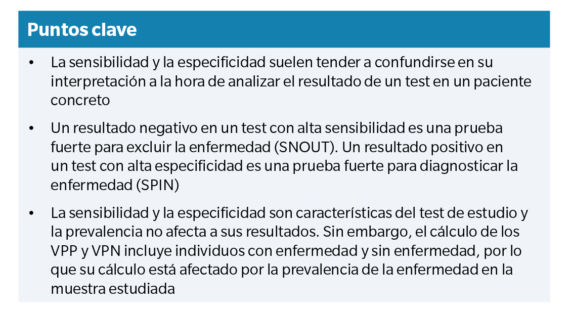 La sensibilidad mide la proporción de personas con enfermedad que tienen un resultado positivo con el test de estudio o test de screening (sensibilidad = VP / (VP + FN) × 100) (Tabla 1). El valor de sensibilidad no puede aportar una recomendación certera en la toma de una decisión de un paciente concreto a pesar de que el resultado del test sea positivo, porque el test tiene falsos positivos que no son tenidos en cuenta en el cálculo de la sensibilidad. De hecho, los falsos positivos son ignorados para calcular la sensibilidad (solo las celdas de VP y FN se usan para calcular sensibilidad). Un resultado positivo, por sí mismo, incluso cuando el test tenga alta sensibilidad, no es realmente útil para decidir si una enfermedad está presente en un paciente concreto. De igual forma, la especificidad mide la proporción de personas sin enfermedad que tienen un resultado negativo del test de estudio (especificidad = VN / (VN + FP) × 100). La especificidad de un test no aporta una indicación adecuada sobre un paciente con resultado negativo en el test porque los resultados negativos del test pueden contener falsos negativos que se ignoran a la hora de determinar la especificidad de dicho test (solo las celdas de VN y FP se usan para el cálculo de especificidad). Un resultado negativo en un test con alta especificidad no es, de ninguna manera, definitivo para descartar una enfermedad en un individuo particular. Estas ideas reflejan el error que comúnmente existe al creer que un resultado positivo en un test altamente sensitivo indica la presencia de una enfermedad o condición y que un resultado negativo en un test altamente específico indica la ausencia de la enfermedad o condición. A pesar de esto, ambos conceptos de sensibilidad y especificidad pueden ser muy útiles si los valores son altos. Existe una relación inversa entre verdaderos positivos y falsos negativos de tal forma que un test con muy alta sensibilidad indica un test en el que existen muchos verdaderos positivos y muy pocos falsos negativos. Es por esto que, en un test con alta sensibilidad, si da un resultado negativo, es muy raro que el paciente tenga la enfermedad o condición. Dicho de otra manera, cuando un test con alta sensibilidad da un resultado negativo permite descartar con bastante grado de seguridad que el individuo tenga la enfermedad. Esto ha llevado a la regla nemotécnica en inglés SNOUT (Sensibility, Negative, OUT-; nótese que la N en SNOUT se refiere tanto a sensibilidad como a negativo). De la misma forma, en el caso de la especificidad existe una relación inversa entre verdaderos negativos y falsos positivos, de tal forma que un test con muy alta especificidad indica un test en el que existen muchos verdaderos negativos y muy pocos falsos positivos. Individuos que han resultado positivos en un test con alta especificidad es muy probable que tengan la enfermedad o condición. Dicho de otra manera, cuando un test con alta especificidad da un resultado positivo, permite asegurar con un grado importante de confianza que el individuo tiene la enfermedad. Esta idea ha derivado en la regla nemotécnica en inglés SPIN (Specificity, Positive, IN-; nótese que la P en SPIN se refiere tanto a especificidad como a positivo).