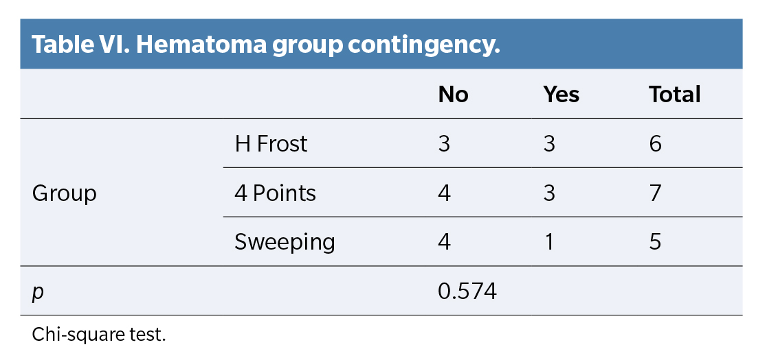 Presence of hematoma. Hematoma was observed in 7 subjects, with 3 from the Frost H group, 3 from the 4-point technique group, and 1 from the sweep technique group. There were no significant differences between groups (p = 0.573, Table 6).