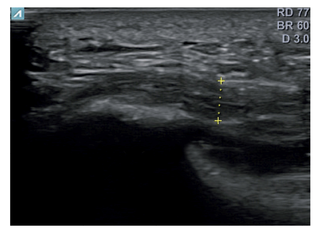 Figure 3. Area of measurement of plantar fascia thickness. The dotted line corresponds to the thickness measurement.