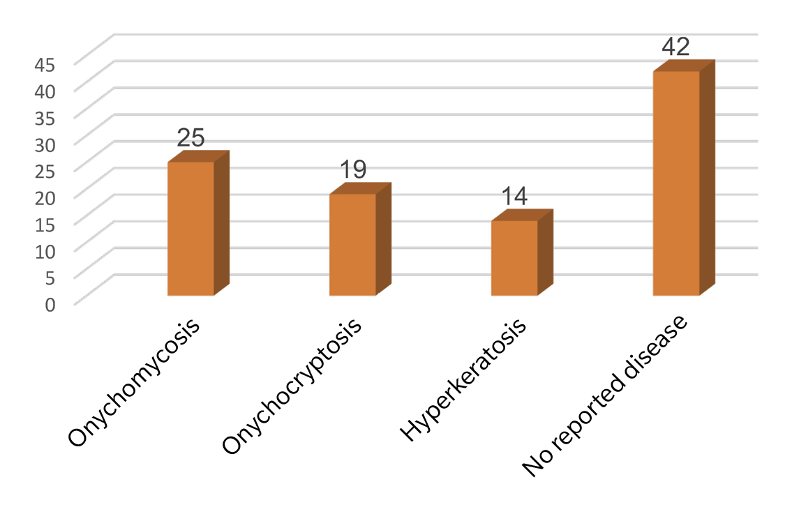 When asked whether they suffered from any of these foot conditions and to specify which, it was observed that more than 50 % of Atarazana residents had experienced some pathology affecting the lower limbs. Among these, onychomycosis was the most common, affecting 25 individuals. At the same time, 19 individuals reported suffering from onychocryptosis, and 14 reported hyperkeratosis. The remaining 42 individuals stated they did not suffer from any of these conditions (Figure 3).