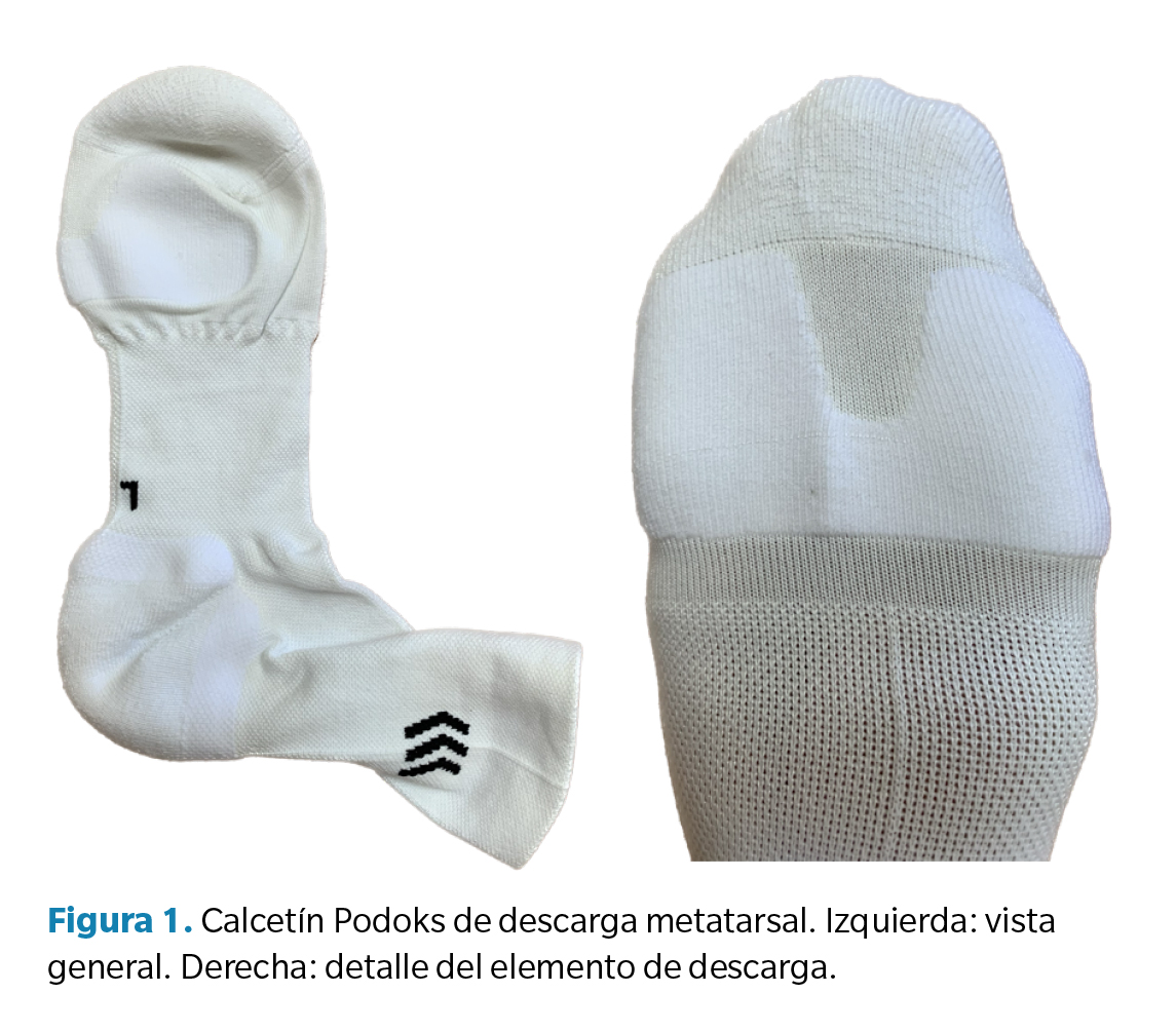 En los últimos tiempos ha surgido la posibilidad de integrar determinados elementos tridimensionales plantares, a modo de piezas ortopédicas, en un elemento que forma parte de la indumentaria habitual del individuo, como son las medias o calcetines. Estos calcetines biomecánicos han mostrado un efecto preliminar positivo en la reducción de las presiones plantares dinámicas bajo las cabezas metatarsales segunda y tercera(22), aunque su efecto a medio o largo plazo todavía no ha sido probado. Este proyecto parte de la hipótesis de partida que unos calcetines con elemento de descarga metatarsal tendrían un impacto positivo en la reducción del dolor asociado a la metatarsalgia. Creemos que se incrementarían el número de horas efectivas de uso de los tratamientos, ya que los calcetines forman parte de la indumentaria habitual de las pacientes. Además, se reducirían los costes asociados, por no requerir reemplazo frecuente de las almohadillas removibles, dispositivos estabilizadores ni revisiones periódicas para adaptar las ortesis plantares. Por ello, el objetivo de este estudio fue valorar el efecto clínico de este dispositivo en pacientes mujeres con metatarsalgia tras un mes de uso de calcetines de alivio metatarsal, respecto a un grupo control con calcetines sin elemento de descarga.