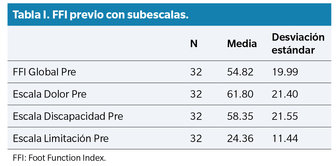 La puntuación media Foot Function Index (FFI) en el grupo global fue de 54.82 ± 19.99. Respecto a las diferentes escalas: 1) el dolor presentó un valor previo de 61.80 ± 21.40; 2) la escala de discapacidad previa fue de 58.35 ± 21.55; 3) escala de limitación presentó una media de 24.36 ± 11.44 (Tabla 1).