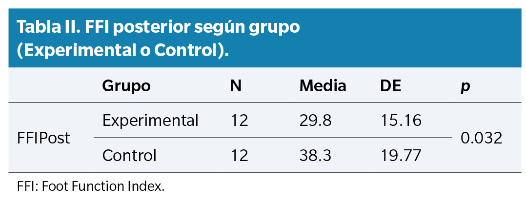 Tras la intervención (30 días de uso intensivo de los calcetines), en la muestra general, se ha observado una mejoría en el estado clínico, reduciéndose en 19 puntos el FFI. Sin embargo, esta reducción no fue homogénea en ambos grupos, ya que el grupo control mejoró 16 puntos, por los 25 puntos del grupo experimental.