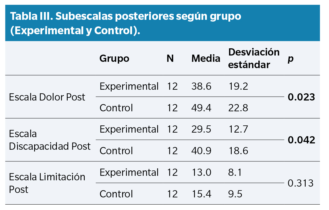 En comparación a las subescalas del FFI tras al mes de seguimiento, en la escala de dolor posterior hemos obtenido una media de 38.6 ± 19.2 en el grupo experimental, por 49.4 ± 22.8 en el grupo control, siendo esta diferencia estadísticamente significativa (p = 0.023, Tabla 3). También se encontró una menor puntuación en el grupo experimental que en control en la subescala de discapacidad (29.5 ± 22.8 vs. 40.9 ± 18.6 respectivamente, p = 0.042, Tabla 3). No se encontraron diferencias en la subescala de limitación (p = 0.313, Tabla 3).