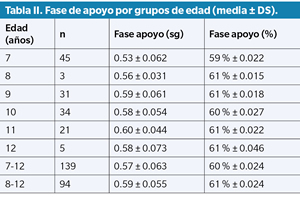 Results: The values in time and percentage of the support phase were shown in each age group studied, as well as in groups from 7 to 12 years old and from 8 to 12 years old: 7 years 0.53 seconds (sec) and 59 %, 8 years 0.56 sec and 61 %, 9 years 0.59 sec and 61 %, 10 years 0.58 sec and 60 %, 11 years 0.6 sec and 61 %, 12 years 0.58 sec and 61 %. The support time in the group from 7 to 12 years old was 0.57 sec and in the group from 8 to 12 it was 0.59 sec.