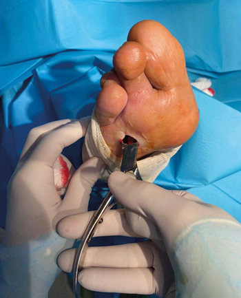 Figura 2. Exéresis quirúrgica de la cabeza del tercer metatarsiano del pie derecho.