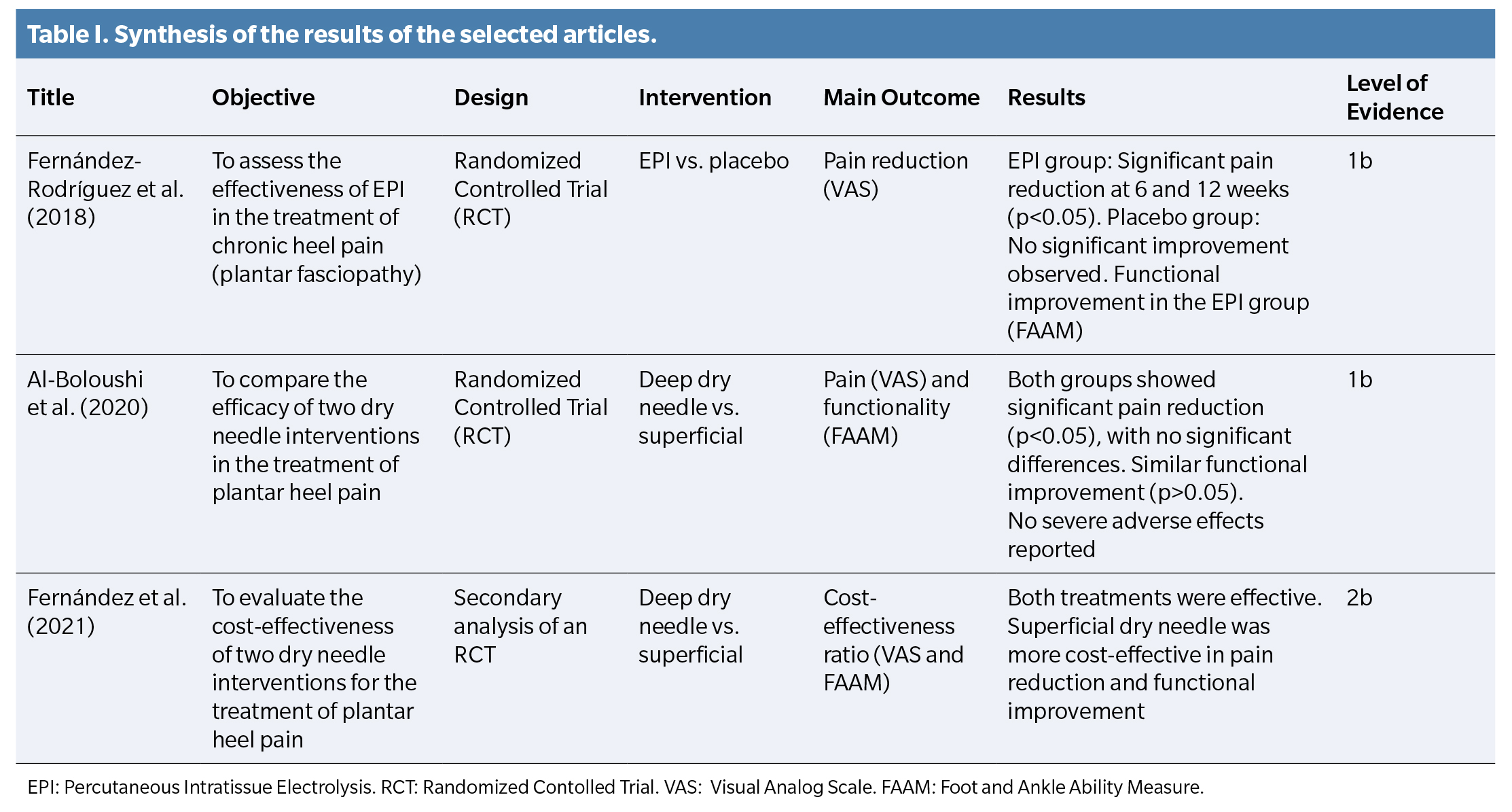 4. Iborra-Marcos Á, Ramos-Álvarez JJ, Rodriguez-Fabián G, Del Castillo-González F, López-Román A, Polo-Portes C, et al. Intratissue percutaneous electrolysis vs corticosteroid infiltration for the treatment of plantar fasciosis. Foot Ankle Int. 2018;39(6):704-11. DOI: 10.1177/1071100718754421.