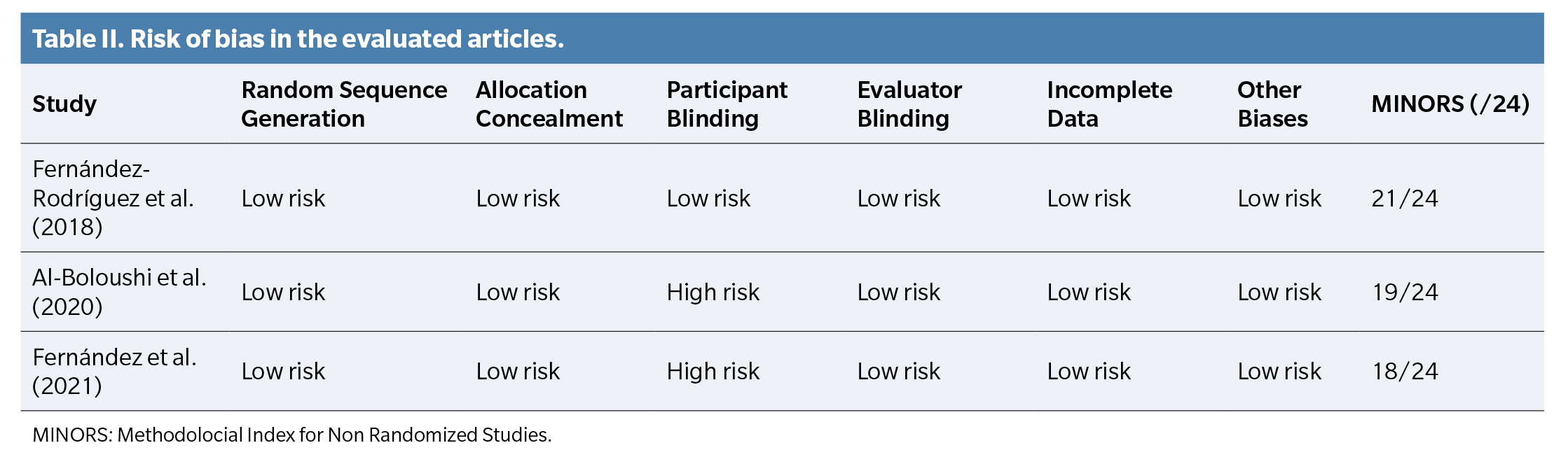 The risk of bias in the selected studies was evaluated using appropriate tools for randomized clinical trials. The results of the bias analysis for each of the articles are shown in Table 2. All studies presented a low risk of bias in most of the domains assessed. However, higher risks were identified in the areas of “blinding of participants” in the study by Al-Boloushi et al. (14) and “blinding of assessors” in the study by Fernández et al. (15).