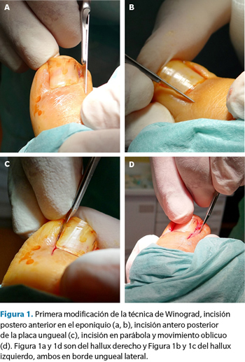 La uña encarnada es un factor común de morbilidad, con un impacto en el absentismo laboral y en la calidad de vida del individuo. Cuando las terapias conservadoras no resuelven el problema, hay que recurrir a procedimientos quirúrgicos, y la técnica de Winograd o escisión en cuña es una de las más habituales. Este estudio pretende demostrar la eficacia de una variación de la técnica original de Winograd para el tratamiento de la uña encarnada, mitigando algunas complicaciones postoperatorias y de recidiva, aumentando la satisfacción general del paciente y disminuyendo el tiempo de recuperación. Estas modificaciones, en el enfoque incisional y la adopción de tiras adhesivas de aproximación, son fáciles de realizar desde el punto de vista técnico.