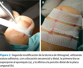 Para mitigar algunos problemas relacionados con sus desventajas, se desarrolló un enfoque que sugiere dos modificaciones a la técnica descrita originalmente20. La primera consiste en suprimir el desprendimiento de la placa ungueal y realizar incisiones directas en el material biológico a extirpar. La segunda, disminuir el potencial infeccioso de las suturas sustituyéndolas completamente por tiras adhesivas de aproximación, que además favorecen el cierre primario de la incisión, sin invadir los tejidos y sin riesgo de dañar la matriz ungueal.