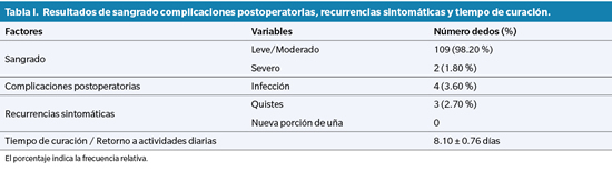 Resultados: Los resultados revelaron 1.8 % de sangrado abundante, 3.6 % de complicaciones postoperatorias, 2.70 % de recurrencias y 8.10 ± 0.76 de días de curación total. Los pacientes reportaron dolor postoperatorio muy bajo (0.9 %) y un grado de satisfacción muy alto (99.1 % satisfacción muy alta para resultado funcional, 94.6 % para el resultado estético y 97.3 % para la satisfacción global del paciente).