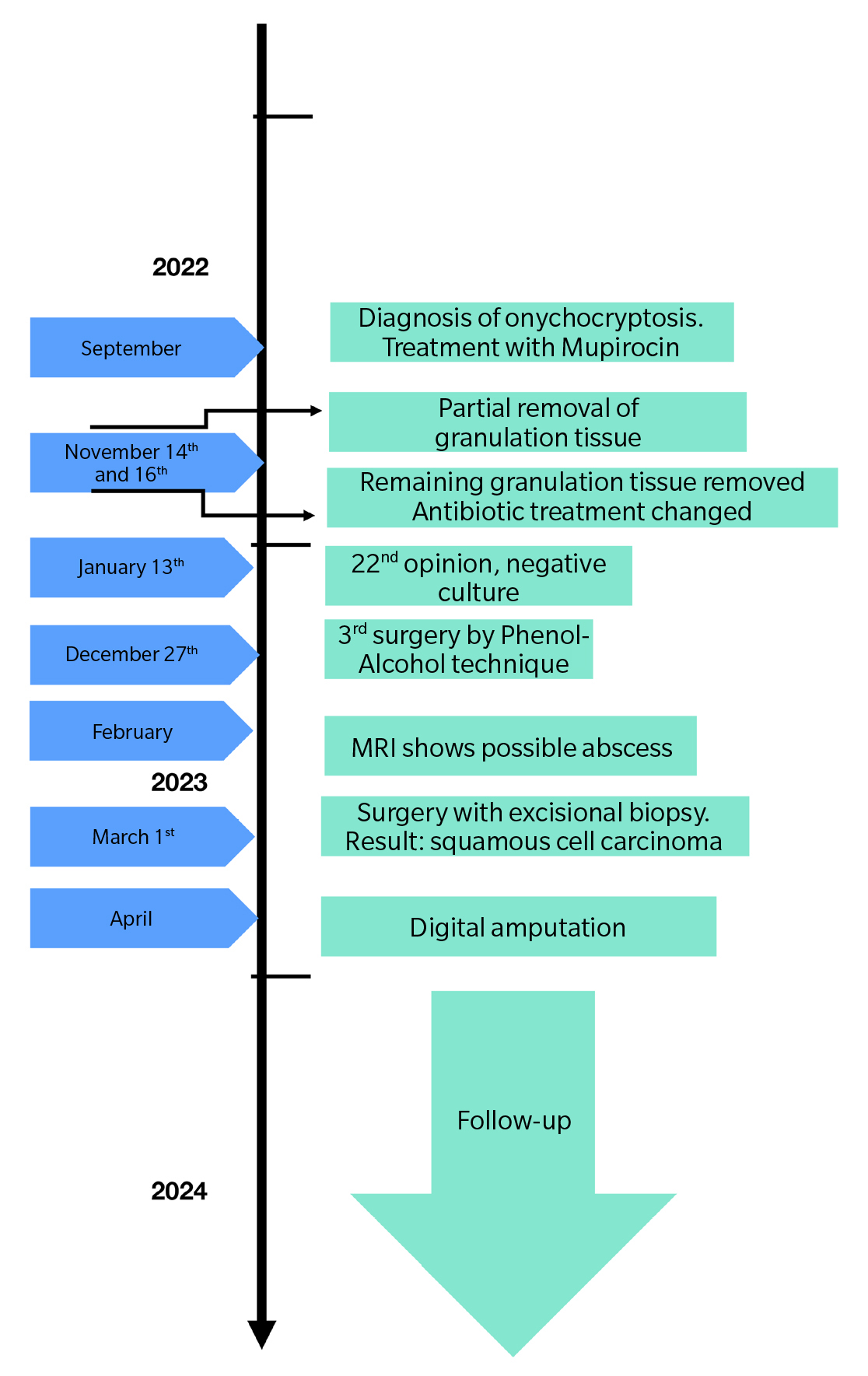 5 days postoperatively, the patient’s first dressing change was performed, which showed a good appearance and no local infection. The patient was explained the result of pathology and referred to the oncology service of her hospital, and from there to the dermatology and plastic surgery service where digital amputation was performed (Figure 10). Subsequent follow-up was conducted by the Oncology service for the next 6 months. After different tests, it was determined that no other treatment was needed. Figure 11 shows the timeline of the clinical case.