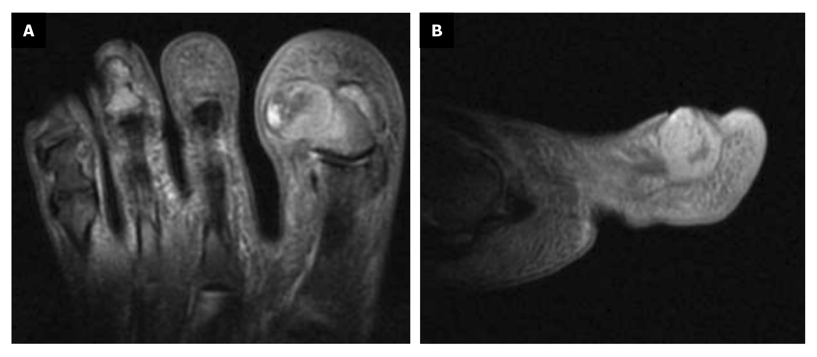 Within 3 weeks after the third intervention, the patient reported recurrence of the lesion and painful symptoms (Figure 7). The patient decided to attend the traumatology department (February 2023) where an MRI (T2FS and DPFATSAT) was requested. It showed an occupying mass in the lateral third of the first toe with well-defined borders and bone involvement (Figure 8) with the following report: “At the level of the distal phalanx of the 1st toe in the nail region, there appears to be a solution of skin continuity with a heterogeneous, a dense 15 mm x 14 mm collection in the lateral region of the parapharyngeal soft tissues, remodeling the bone and coming into contact with the flexor tendon, which could be consistent with a postoperative abscess/phlegmonous collection. Some bone edema in the distal phalanx is suspected, without completely ruling out incipient osteomyelitis. To be correlated with medical history and surgical protocol performed.”