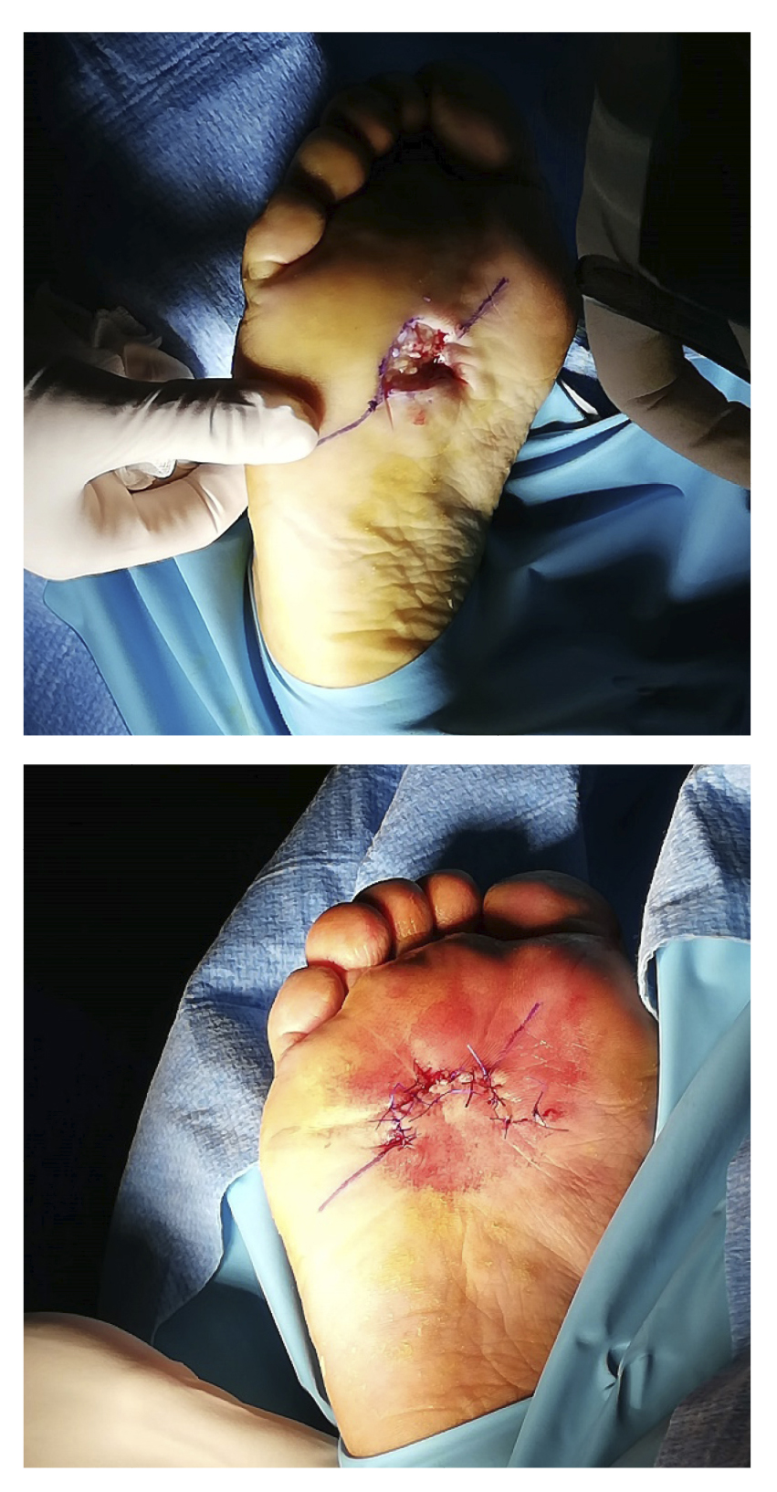 The surgical procedure consisted of complete resection of the lesion, followed by closure using an advancement flap, designed considering the size of the lesion, local skin tension, and biomechanical implications in the weight-bearing area, with the aim of minimizing postoperative complications.