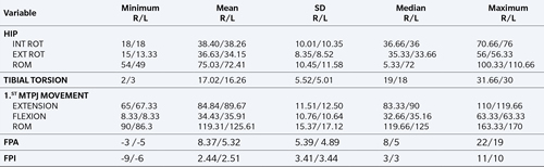 R: right. L: left. INT ROT: internal rotation. EXT ROT: external rotation. ROM: range of motion. 1ST MTPJ: first metatarsophalangeal joint. FPA: foot pregression angle. FPI: foot posture index.