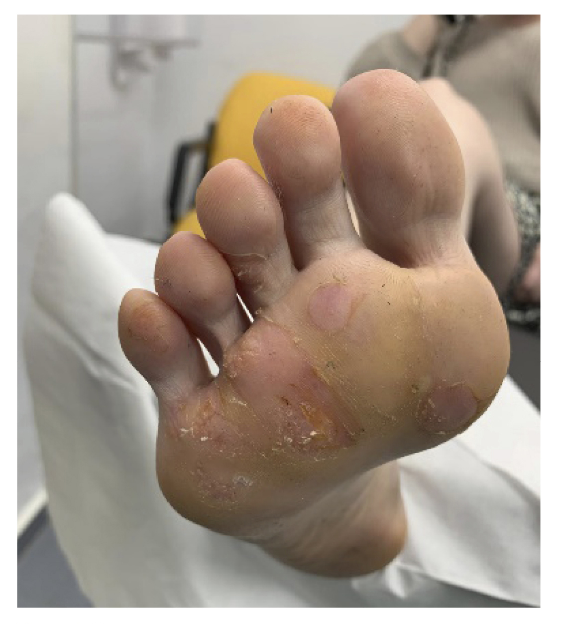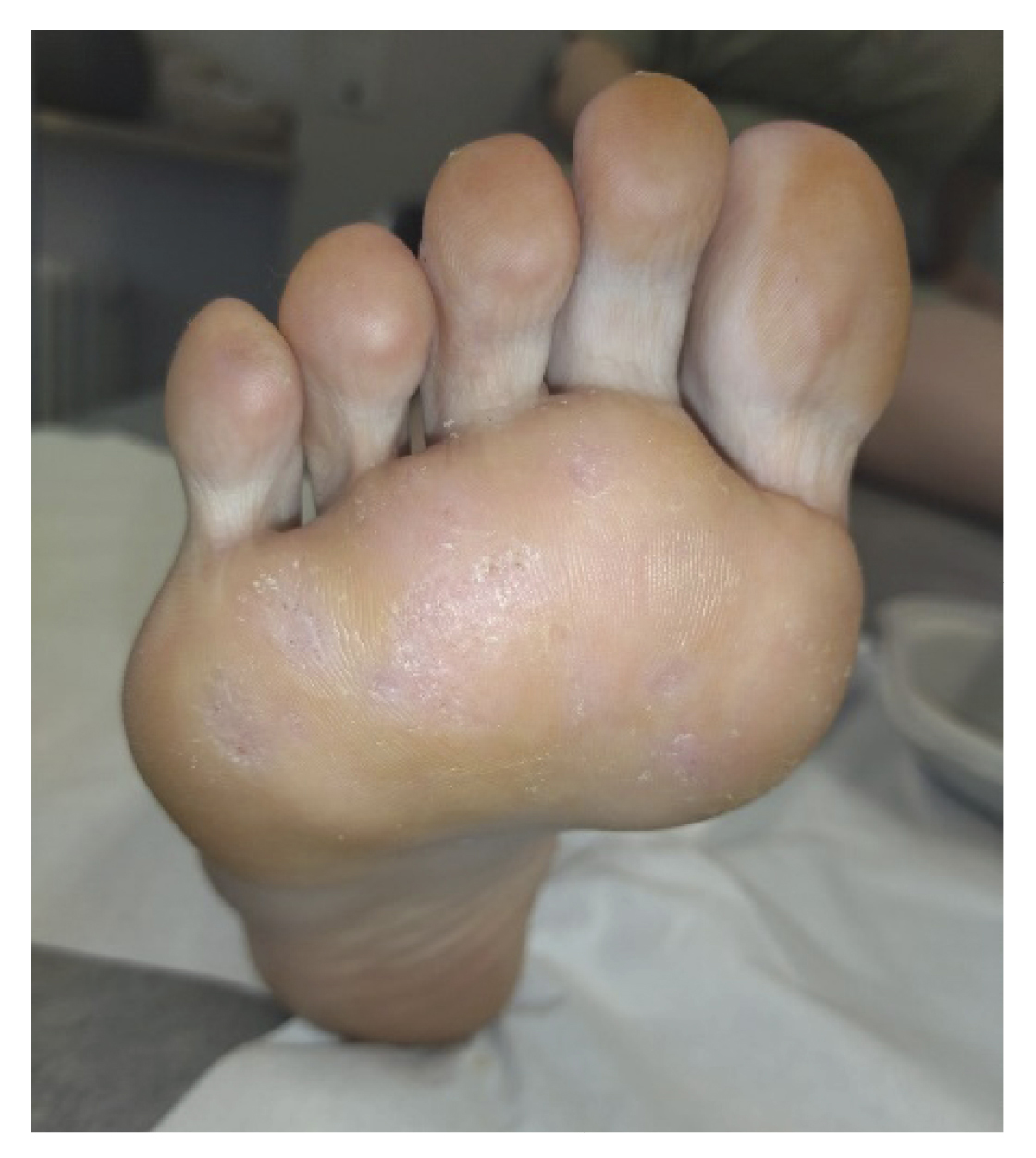 Upon inspection, multiple mosaic plantar warts were observed in the plantar area of the metatarsal heads and at the level of the third and fourth toes of the right foot (Figure 1). Additionally, excessive sweating was observed throughout the foot.