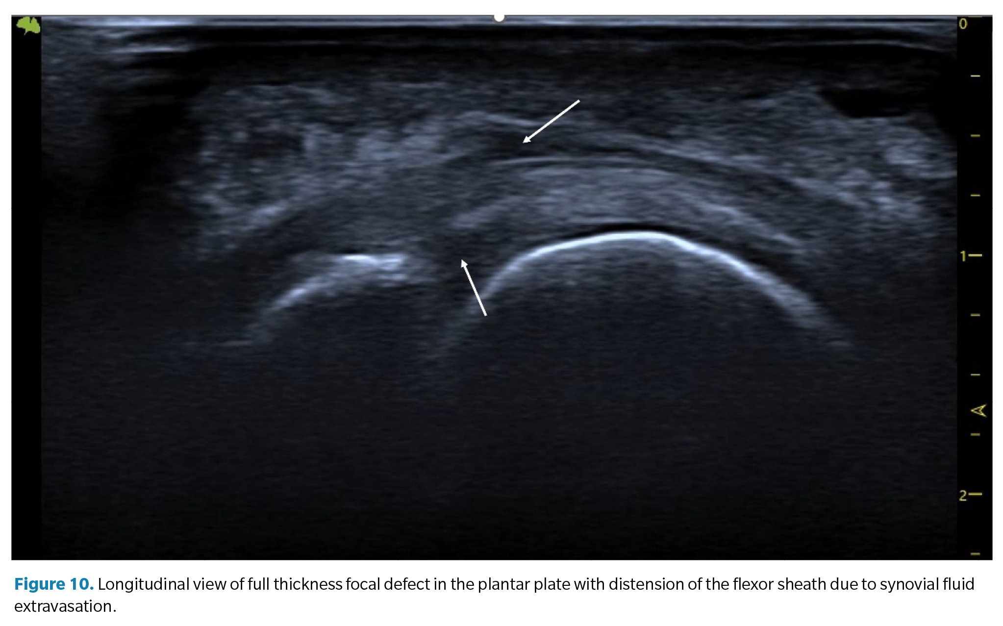 Finally, it is always useful to perform comparative ultrasounds with the plantar plate of the contralateral foot when it is asymptomatic, especially if there are doubts about a less conclusive injury during the examination.