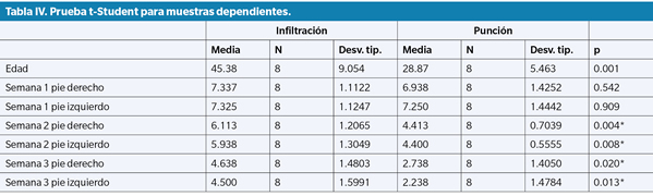 Podemos observar cómo la media del nivel del dolor disminuye cada vez que aplicamos el tratamiento. Al realizar la prueba t-student entre el grupo experimental y el grupo control entre aquellas variables que están distribuidas normalmente, en la primera semana del estudio, la media del dolor es similar entre los pacientes del grupo de infiltración y del grupo de punción seca. Sin embargo, podemos destacar que en la tercera semana del estudio la media del dolor en el pie derecho de infiltración es 4.638 ± De, mientras que en el pie izquierdo del grupo control la media es 2.738 (p = 0.020) (Tabla IV).